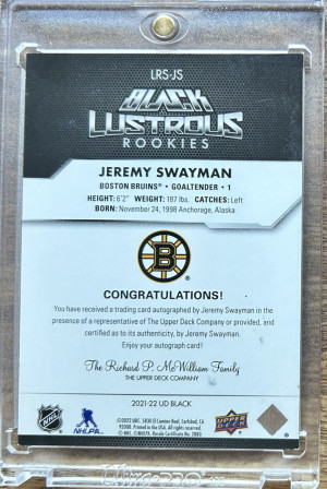 2021-22 UD Black Jeremy Swayman Black Lustrous Rookies AUTO /199