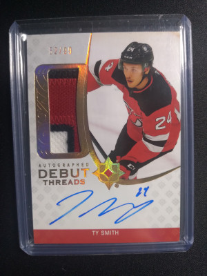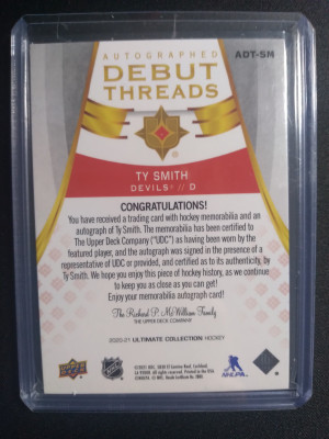 Ty Smith 2020-21 Ultimate Autographed Debut Threads 3 color patch