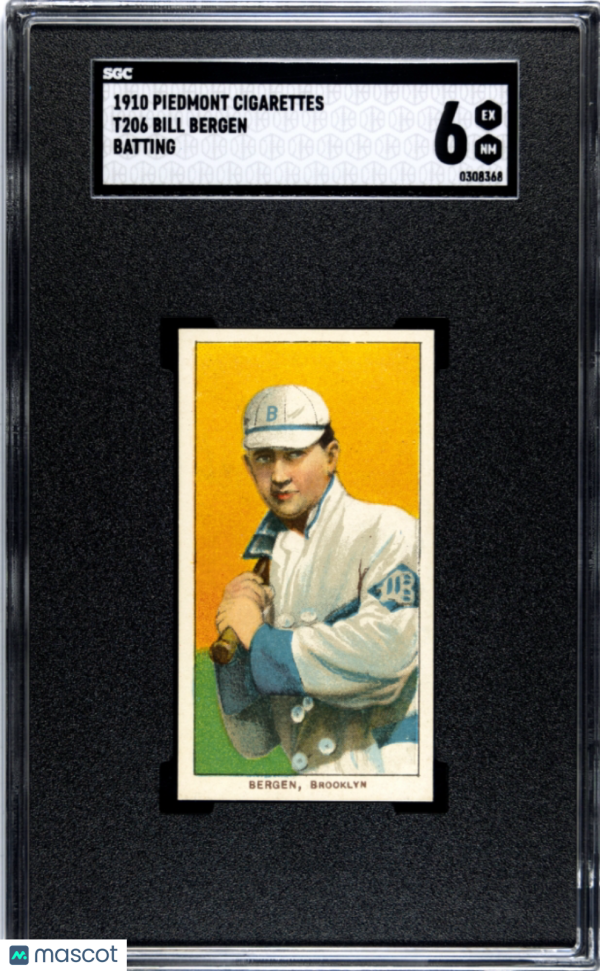 You are purchasing a 1910 Piedmont Cigarettes (T206) Bill Bergen SGC 6.0. You will receive the exact item in the photographs. Thank you for looking. Listed with Mascot.