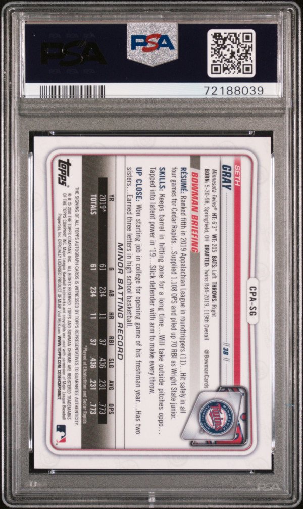 2020 Bowman Chrome Prospect Autographs Seth Gray #CPASG PURPLE REF. PSA 10