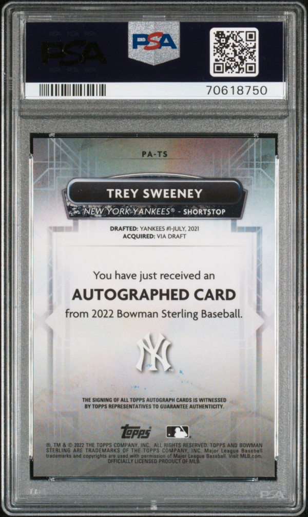 2022 Bowman Sterling Trey Sweeney /50 Gold Refractor Auto PSA 8