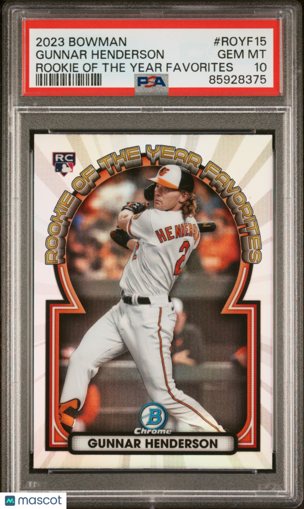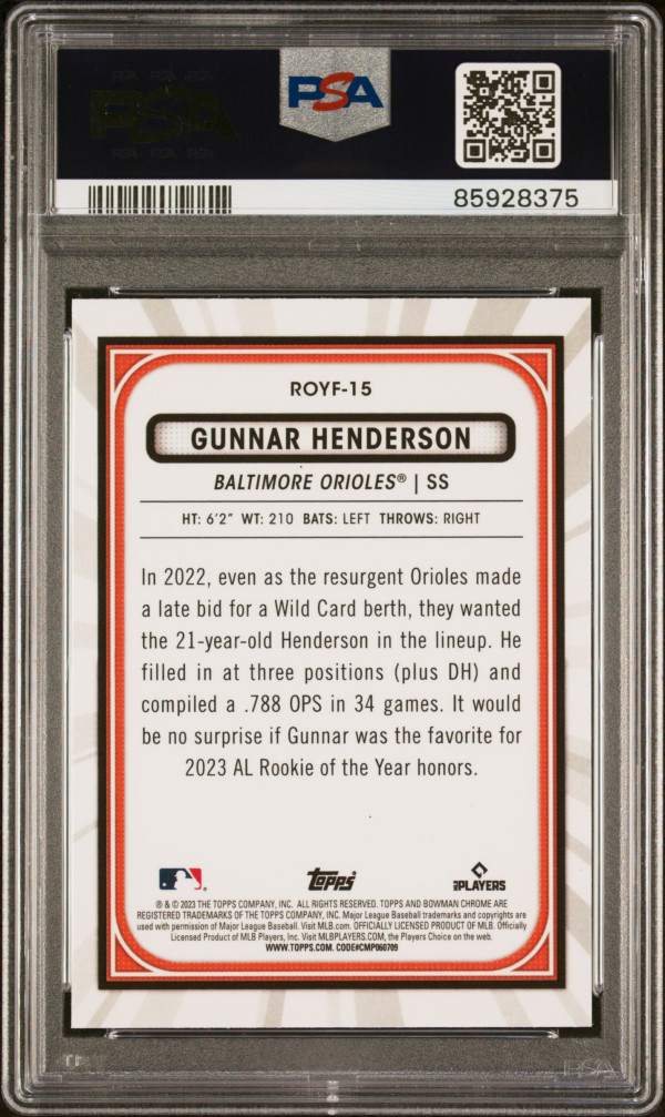 You are purchasing a 2023 Bowman Rookie Of The Year Favorites Gunnar Henderson #ROYF15 PSA 10. You will receive the exact item in the photographs. Thank you for looking.