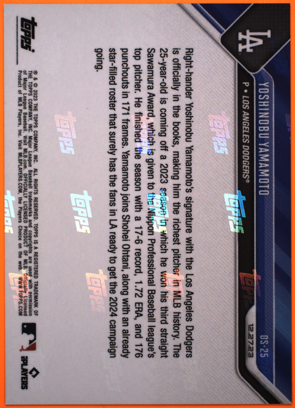 Thanks for your looking at my listing 2023 Topps Now Off-season Yoshinobu Yamamoto . Let me know if you have any questions!