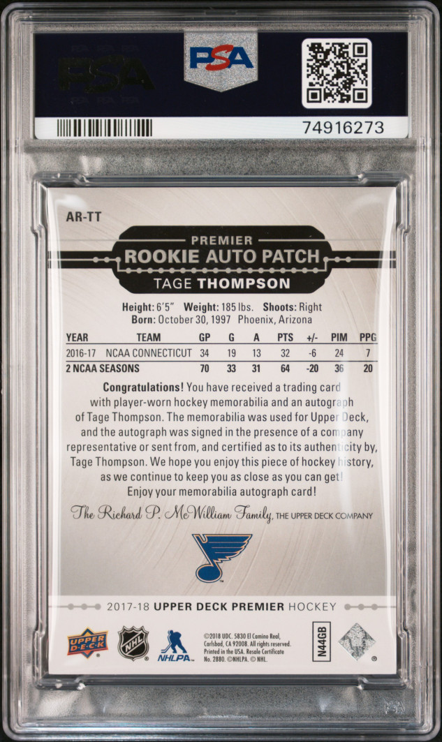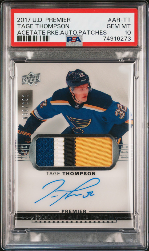 You are purchasing a 2017 Upper Deck Premier Acetate Rookies Autograph Patches Tage Thompson #AR-TT Acetate Rke.Auto.Patches PSA 10. You will receive the exact card in the photographs. Thank you for looking. Listed with Mascot.