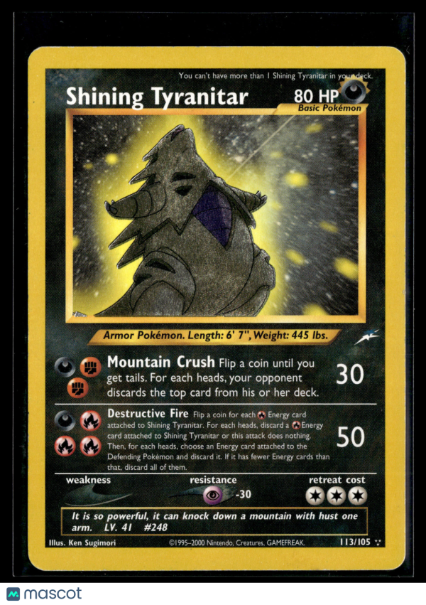 You are purchasing a 2001 Pokemon Shining Tyranitar #113/105. You will receive the exact item in the photographs. Thank you for looking.